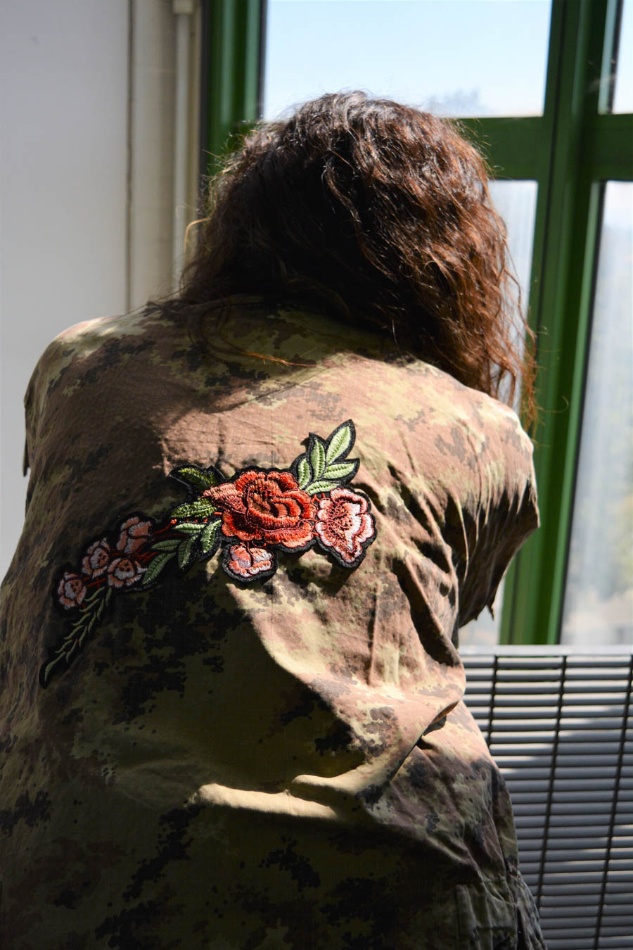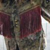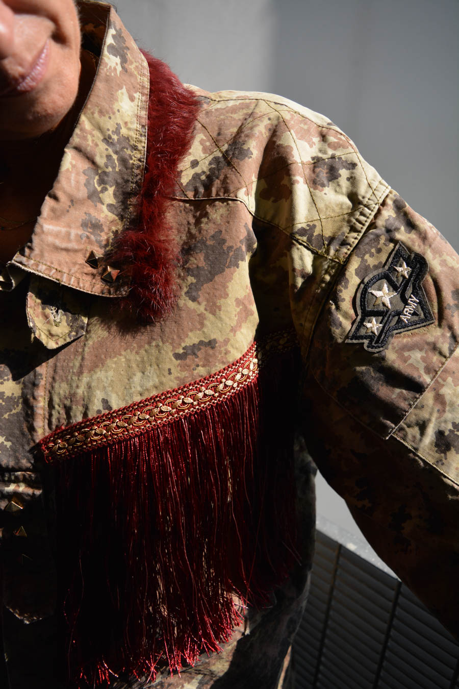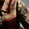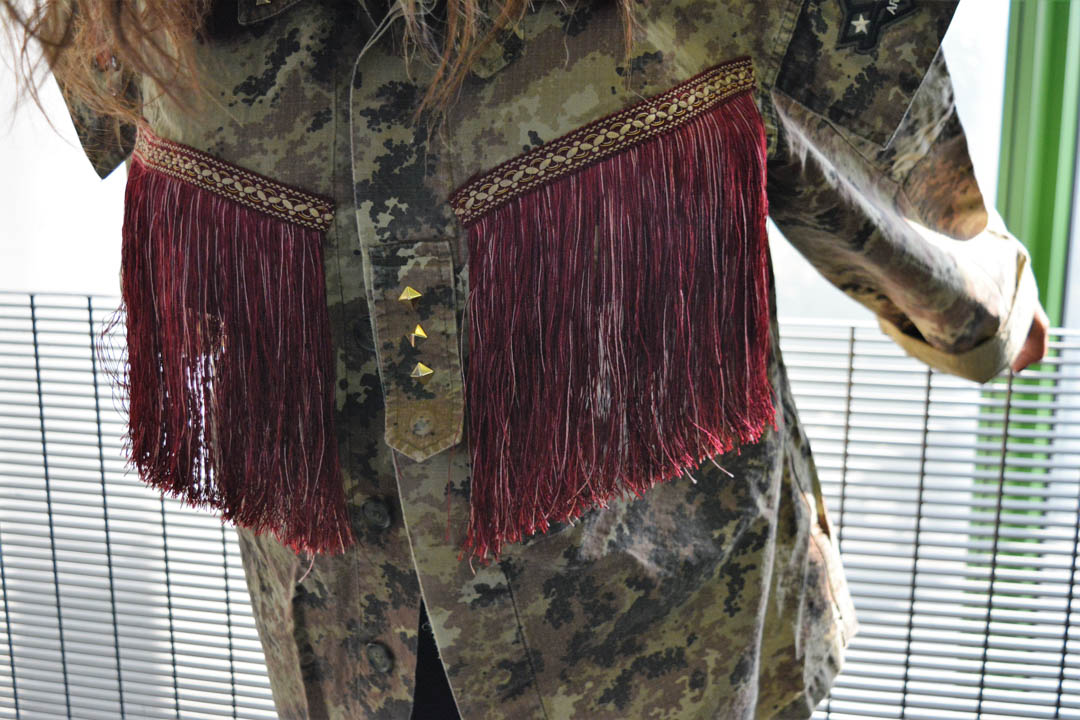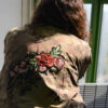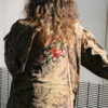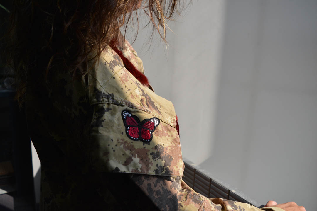 Vi presento le nuove giacche militari vintage, rivisitate e trasformate da me. Diciamo che sono taglia unica, qualcuna più slim, qualcuna più over. In cotone camouflage sui toni del militare, con applicazioni in paillettes e borchie. Questa l’ho pensata sui toni del bordeaux partendo dal collo dove l’ho impreziosita con un bordo in Lapin, poi ha un bellissimo ramo di rose ricamate applicato sulla schiena e delle super frange vintage preziosissime. Una farfallina da un tocco in più alla manica.