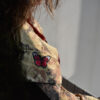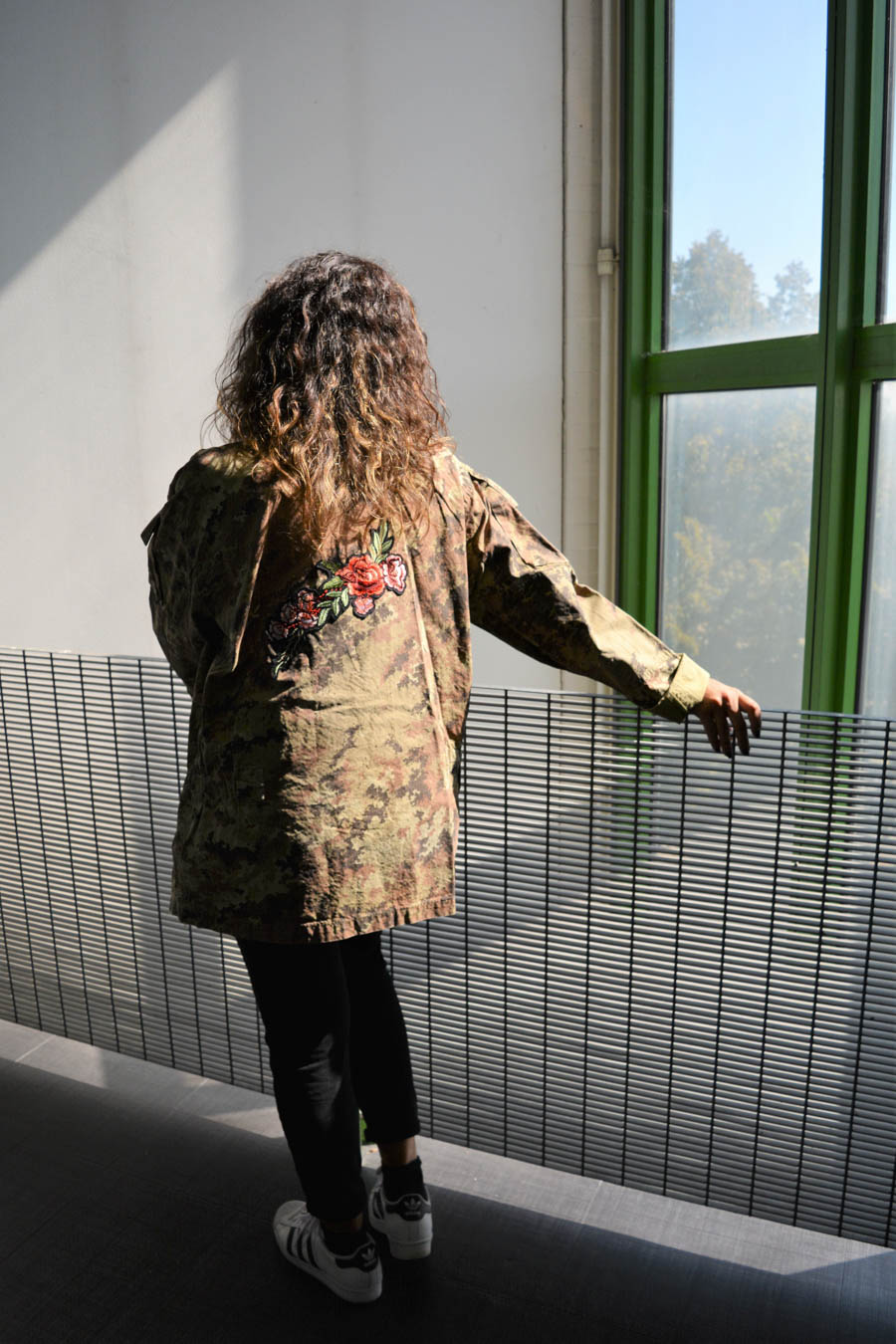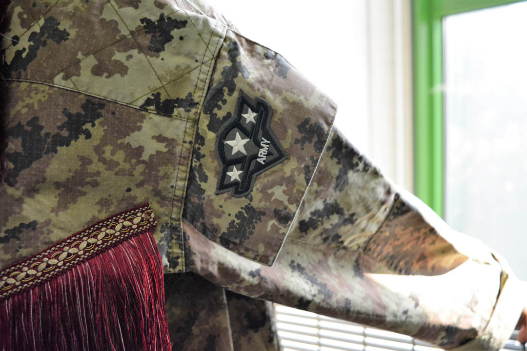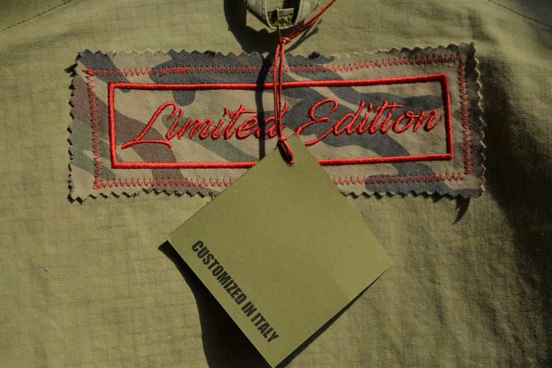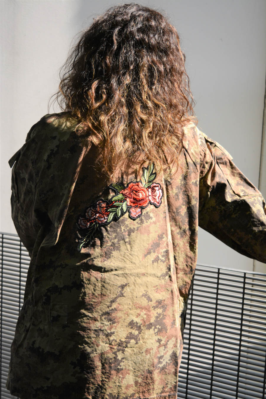 Vi presento le nuove giacche militari vintage, rivisitate e trasformate da me. Diciamo che sono taglia unica, qualcuna più slim, qualcuna più over. In cotone camouflage sui toni del militare, con applicazioni in paillettes e borchie. Questa l’ho pensata sui toni del bordeaux partendo dal collo dove l’ho impreziosita con un bordo in Lapin, poi ha un bellissimo ramo di rose ricamate applicato sulla schiena e delle super frange vintage preziosissime. Una farfallina da un tocco in più alla manica.